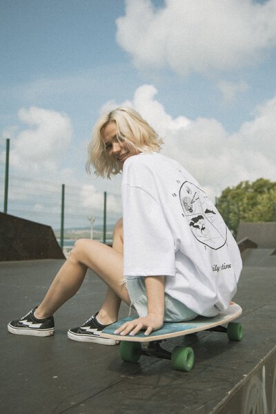 Our oversized t-shirt made of velvet jersey with a print on the back. Every surfer knows that the schedule is everything! Put together your "24 hours" set with a black oversized hoodie "Daily routine p.m." And see you at the line-up!