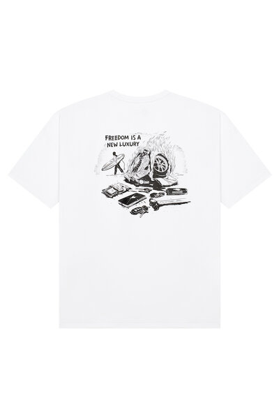 Oversize cotton T-shirt with a print on the back and an inscription on the front side. It’s pleasant to the body and relaxed fit, so you could feel as comfortable as possible in any situation.