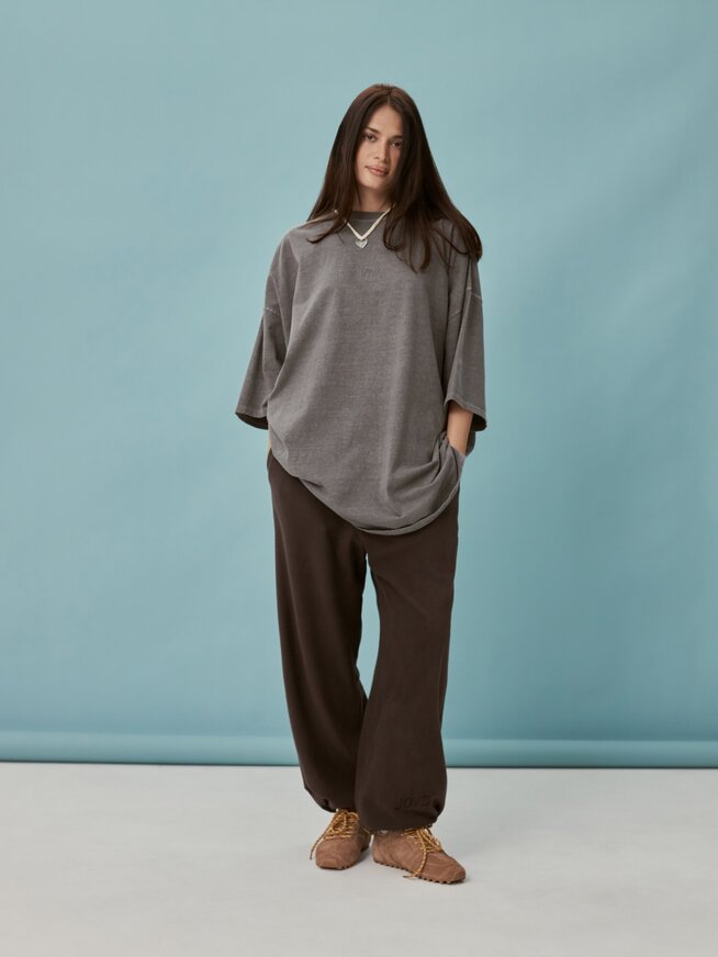 Wide relaxed fleece pants with drawstring at the bottom in a universal brown color for your comfortable looks:)